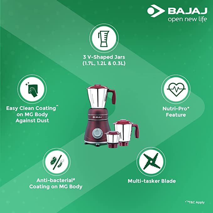 • Anti Germ Coating on the Mixer Grinder Body for protection against germs resulting into hygienic and healthy mixing and grinding