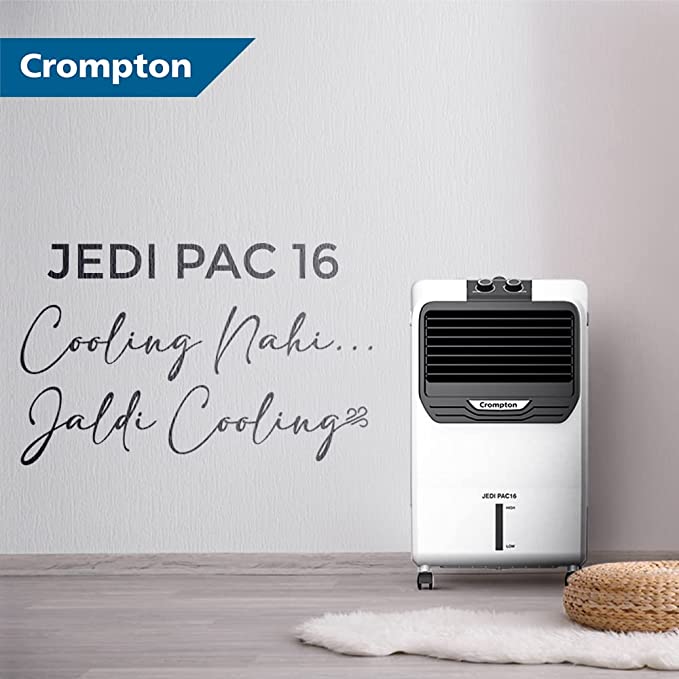 - Product: Crompton Jedi PAC 16 Personal Air Coolerwith water tank capacity (upto brim) of 16 L; Suitable for 140 sq. ft. room size