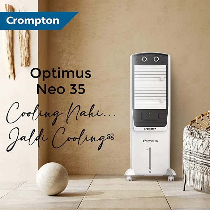 - Product: Crompton Optimus Neo 35 Tower Air Coolerwith water tank capacity (upto brim) of 35 L; Suitable for 160 sq. ft. room size