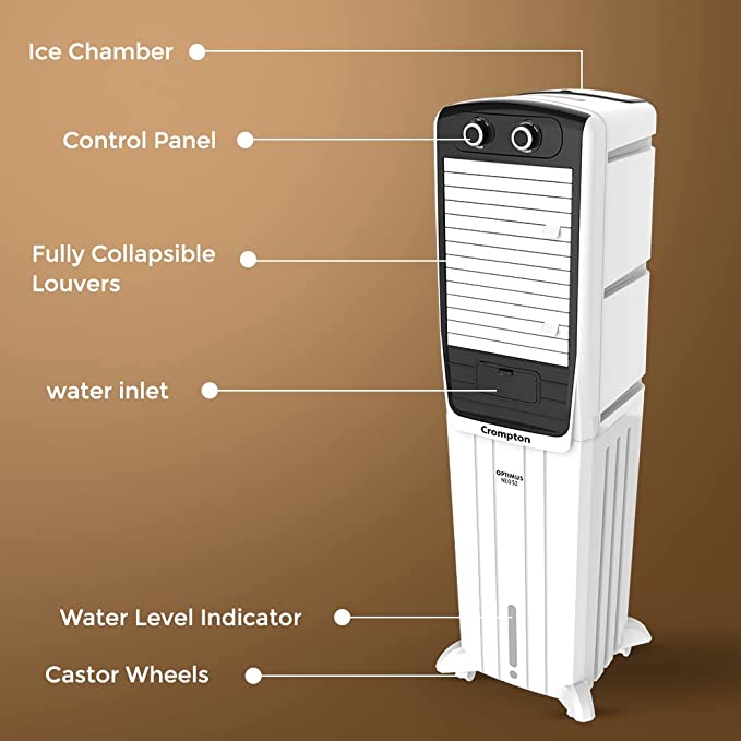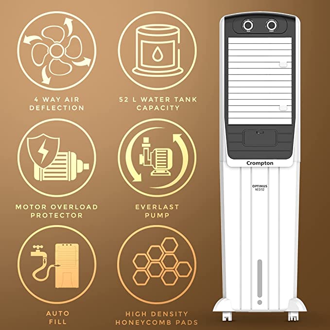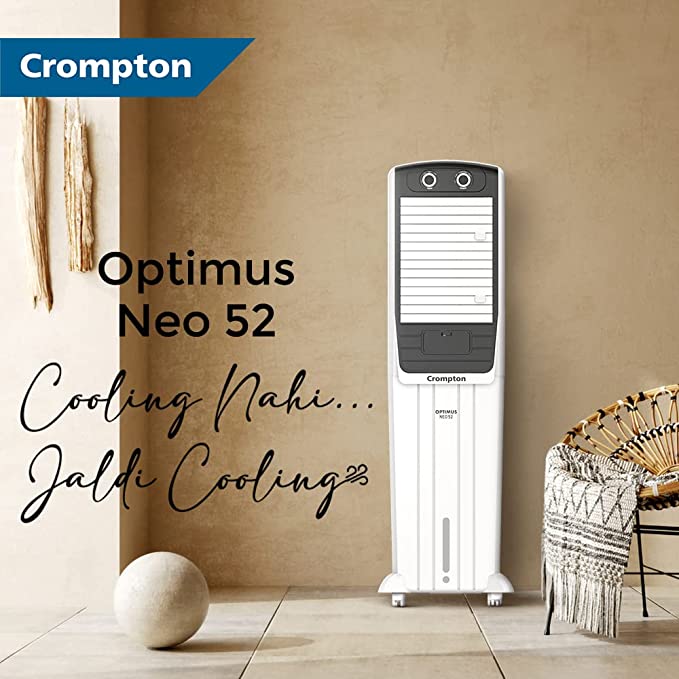 - Product: Crompton Optimus Neo 52 Tower Air Coolerwith water tank capacity (upto brim) of 52 L; Suitable for 160 sq. ft. room size