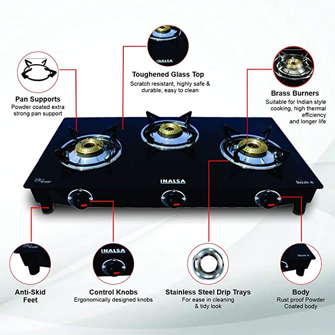 - 3 High Efficiency Brass Burner , Auto ignition : No , ISI certified : Yes
