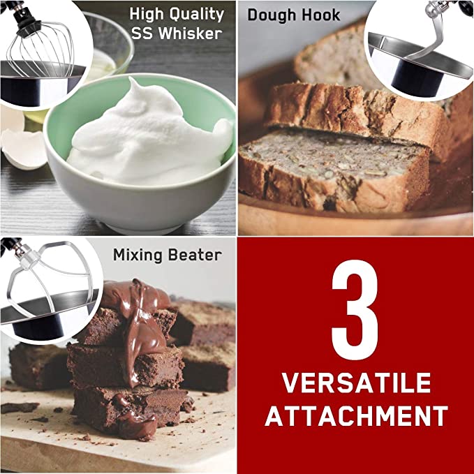 - Included – 1N Main Unit with SS Bowl, 1N Whisking Cone, 1N Dough Hook, 1N Mixing Beater, 1N Splash Guard, 1N Instruction Manual cum Warranty Card