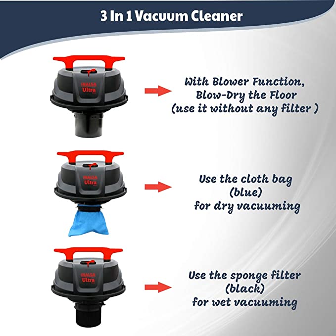 - Wet/dry or Bagged/Bagless-No matter it is dust,hair,daily waste,the device can clean the dirt perfectly.No need to change filter during operation.Cloth dust filter for dry & use sponge filter for wet