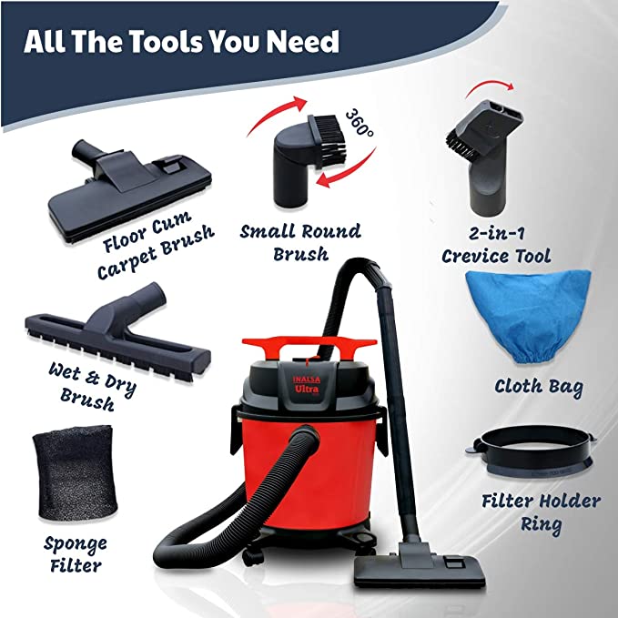 - Includes-Vacuum Cleaner, 3Extension Tubes,Hose Pipe,Floor Cum Carpet Brush,Dry/Wet Squeezing Brush,Crevice Nozzle,Small Round Brush,Cloth Filter,Sponge Filter,Carry Handle,Warranty Card
