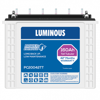 - Key Features Luminous Battery 160 Ah – PC20042 Tall Tubular Battery Types: Tall Tubular Battery, Capacity: 160Ah (12V) Recommended Inverter Capacity: Minimum 850v Charging: Fast charging, Longer backup Warranty: Warranty: 24M + 18*M= 42*Months